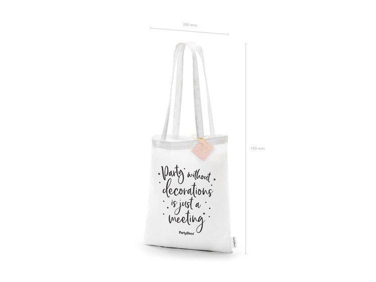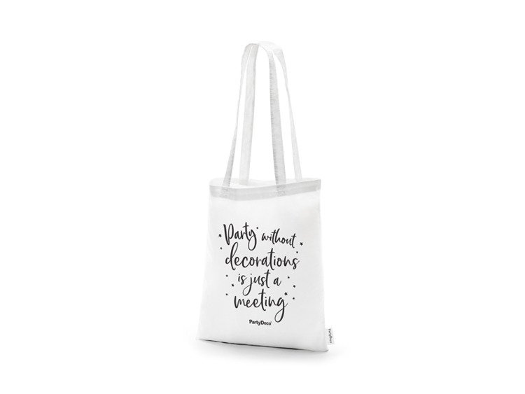 Torba na zakupy wykonana z bawełny w kolorze białym z czarnym napisem Party without decorations is just a meeting, rozmiar ok. 39 x 42 cm.(1 karton / 24 szt.)