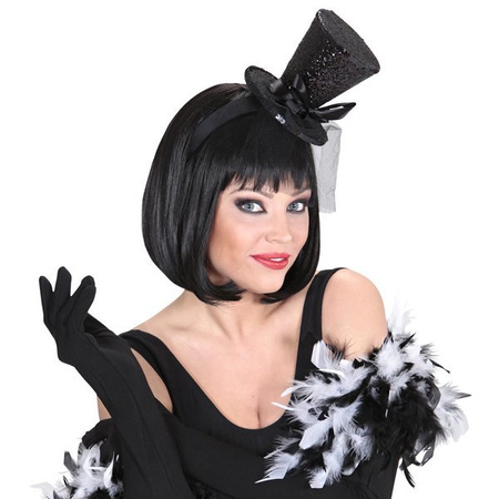 Zdobiony czarną satynową tasiemką, woalką z tiulu oraz cekinami na obrzeżach.