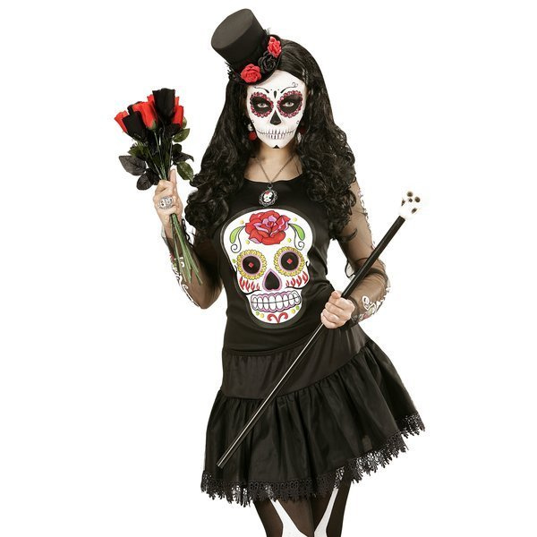Zdobiony tiulem oraz czarno czerwonymi różami.