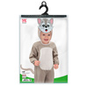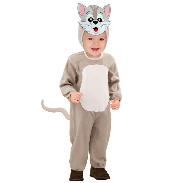Strój w kolorze szarym, Czapka z głową kota, wiązana pod szyją.