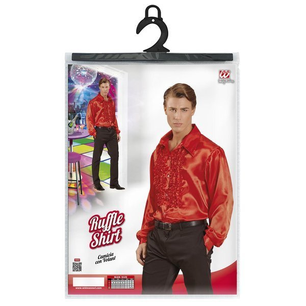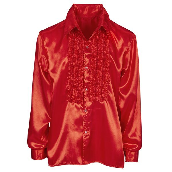 Koszula w kolorze czerwonym, wykonana z materiału o satynowym połysku.