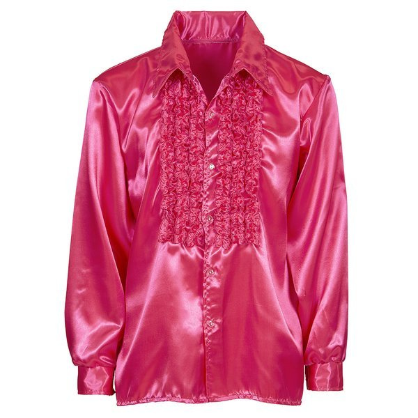 Koszula z żabotem w kolorze różowym. Wykonana z materiału imitującego satynę, zapinana na guziki.