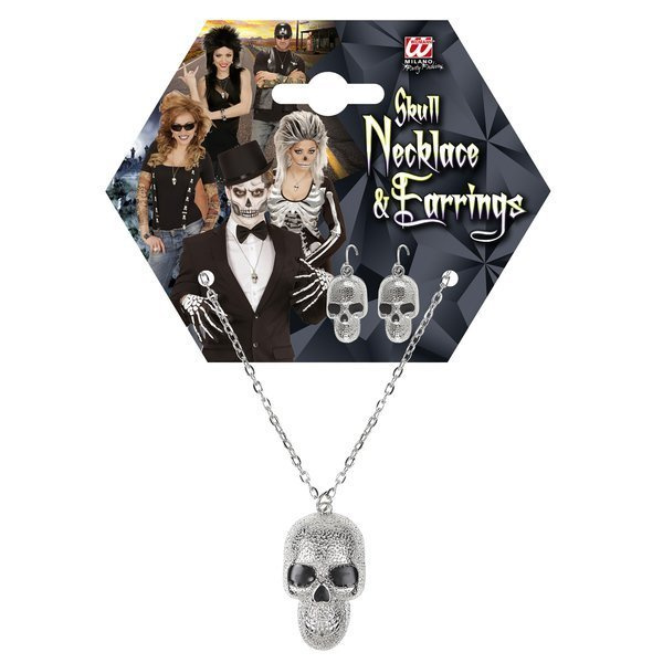 Naszyjnik w kolorze srebrnym z czarnym wypełnieniem oczodołów.