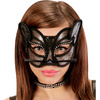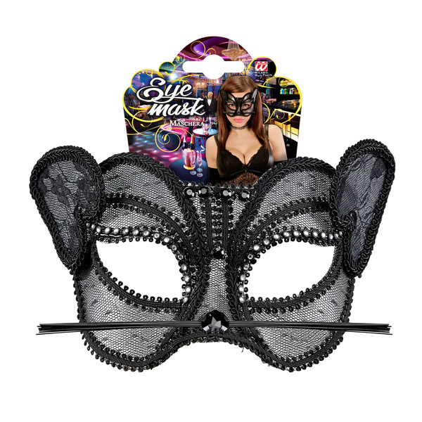 Maska kota w kolorze czarnym, ozdobiona czarną koronką.