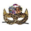 Maska w cętki lamparta obszyta materiałem i ozdobiona złotym brokatem.