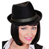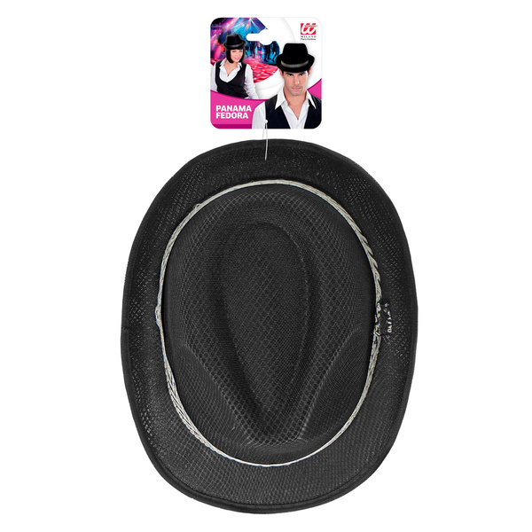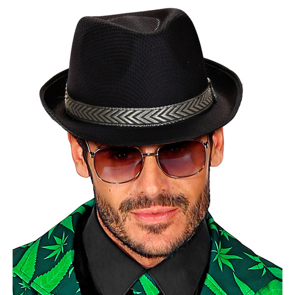 Czarny kapelusz przepasany wzorzystą tasiemką.