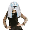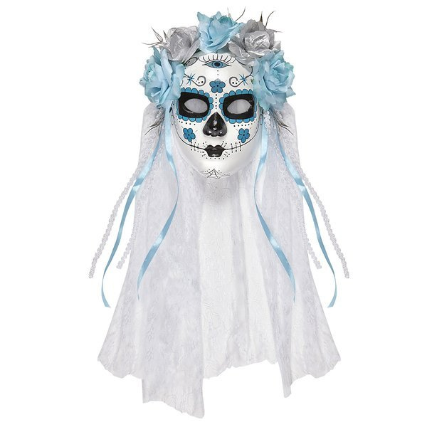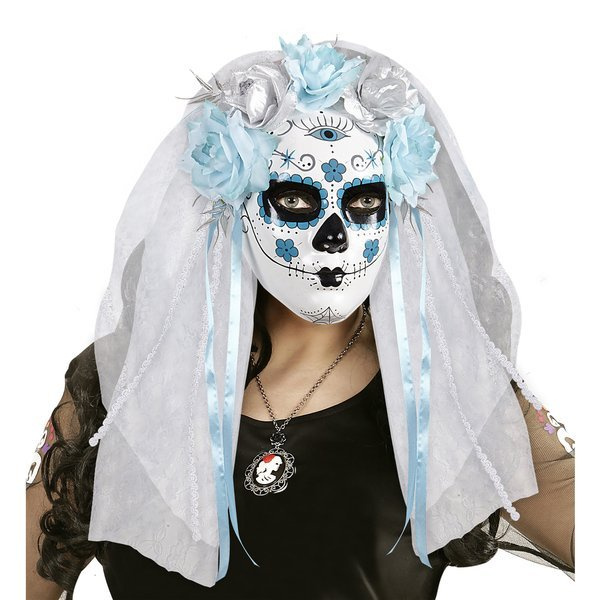 Maska Meksykańska z Welonem, styl meksykański, kolor biało-czarno-niebieski, dodatkowo do maski doklejony białyy koronkowy welon z tasiemkami, maska wykonana z twardego tworzywa sztucznego, mocowana z tyłu na tasiemce
