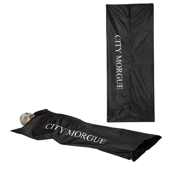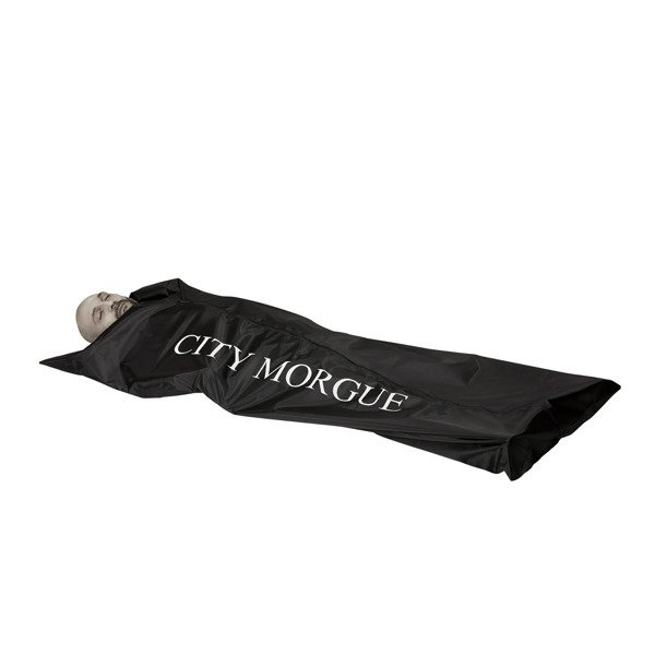 Halloweenowa dekoracja w postaci worka na zwłoki.