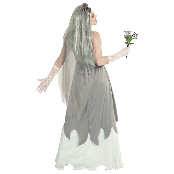 Zestaw zawiera: sukienkę, welon ozdobiony ciemnymi różami oraz bukiet kwiatów.