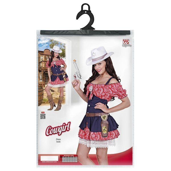 Strój kowbojki. Sukienka w kolorze czerwono-fioletowym wykończona białą koronką. Idealne przebranie karnawałowe.