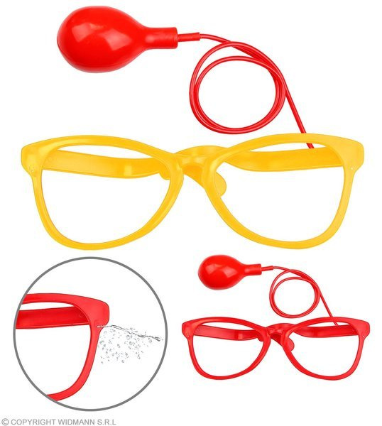 Duże okulary klauna w kolorze żółtym, psikające wodą.