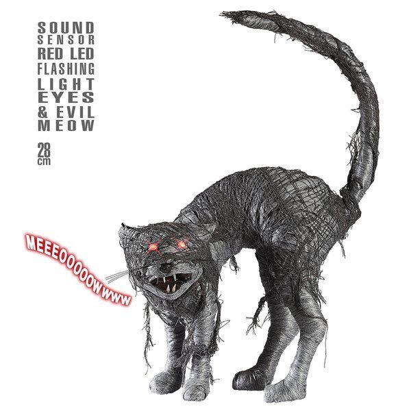 Interaktywny Kot Zombie, Dekoracje, Halloween, kolor szary, kot wydaje dzwięk w postaci przeraźliwego miauczenia i maświecące oczy na czerwono, idelana dekoracja na imprezę Halloween