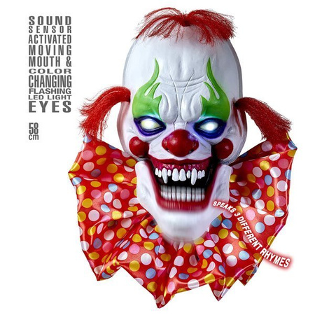 Dekoracja interaktywna halloweenowa w postaci głowy klauna. Głowa klauna w kolorze białym z doczepionymi czerwonymi kosmykami włosów. Posiada charakterystyczny makijaż. W oczach zamontowane diody zmieniające kolor. Dodatkowo produkt wydaje dźwięki oraz porusza ustami. Wielkość ok 58 cm.