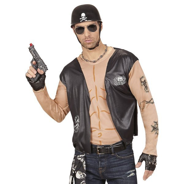Strój motocyklisty. Koszulka na długim rękawie w kolorze beżowym zdobiona czarnymi nadrukami imitującymi tatuaże. Do koszulki wszyta kamizelka.