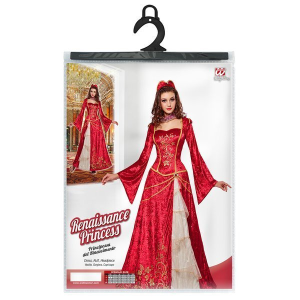 Suknia długa w kolorze czerwonym zdobiona złotą lamówką oraz wzorami.