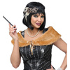 W zestawie narzutka futrzana w odcieniach brązu oraz cekinowa opaska zdobiona piórami.