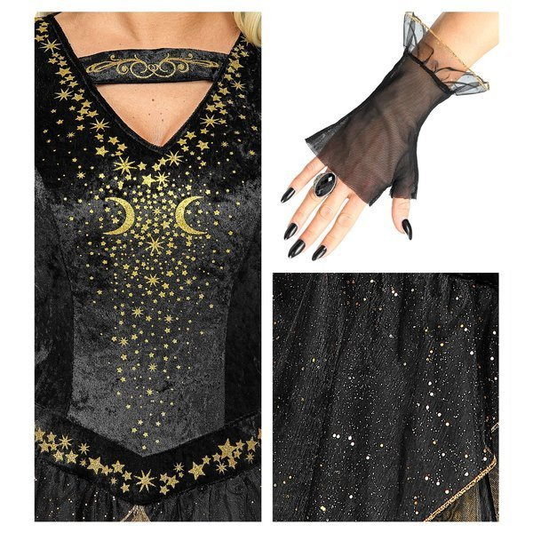 Sukienka w kolorze czarnym ozdobiona złotymi gwiazdkami i tiulem.