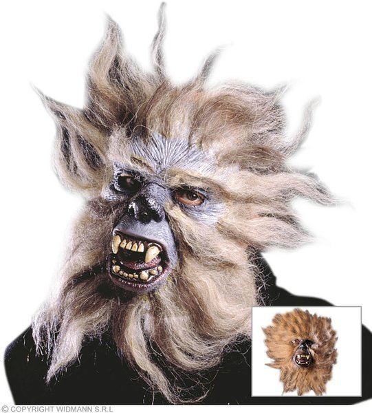 Maska lateksowa wściekły szympans. Maska w kolorze brązowym. Wykończona brązowo-rudym futerkiem. Maska zakrywa tyłu głowy.