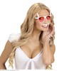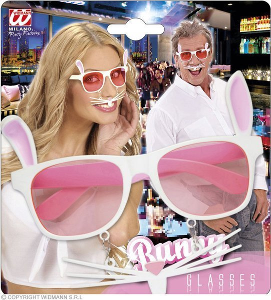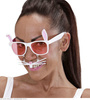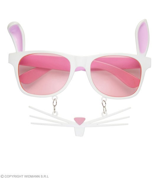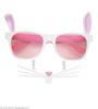 Okulary wykonane z solidnego tworzywa sztucznego, stylizowane na zająca, królika. Oprawki w kolorze białym. Szkła w kolorze różowym.