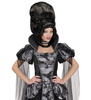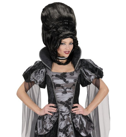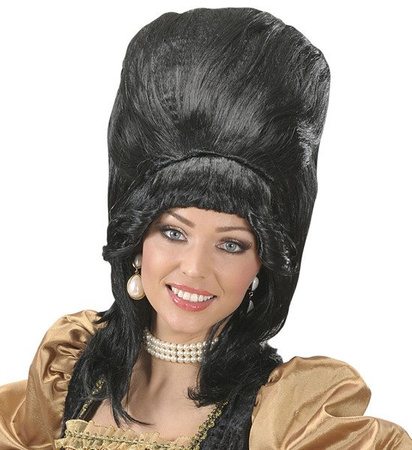 Peruka w kolorze: czarnym, włosy od czubka głowy mocno tapirowane, boki luźno się układają.