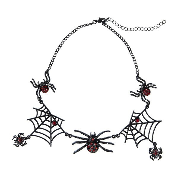 Naszyjnik w kolorze czarnym ozdobiony pająkami z czerwonymi cekinami i pajęczyną.