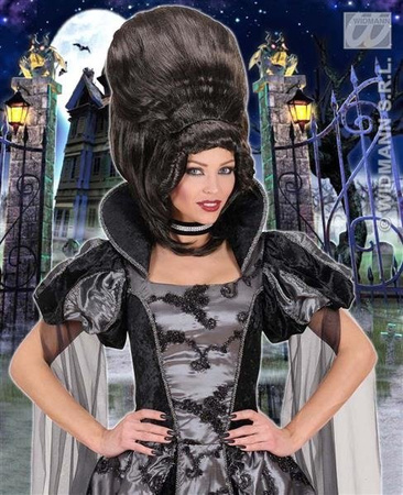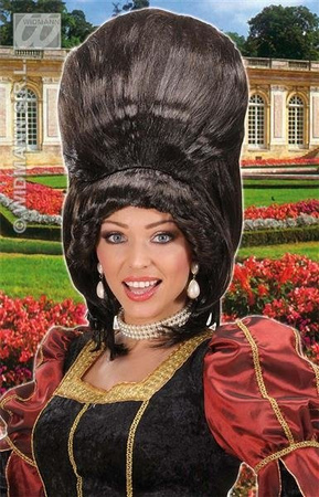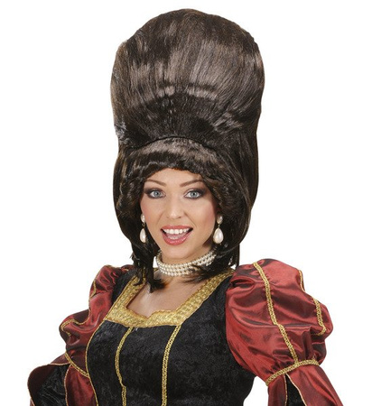 Peruka w kolorze: czarnym, włosy od czubka głowy mocno tapirowane, boki luźno się układają.