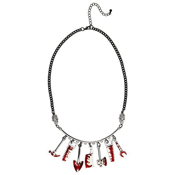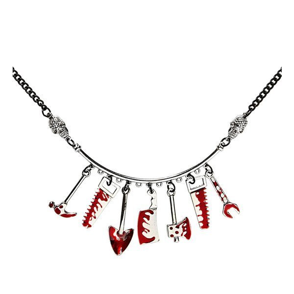 Narzędzia pokryte czerwoną farbą imitującą krew.