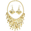 Wyrazisty naszyjnik i kolczyki w kolorze złotym ze zdobieniami w kształcie monet.