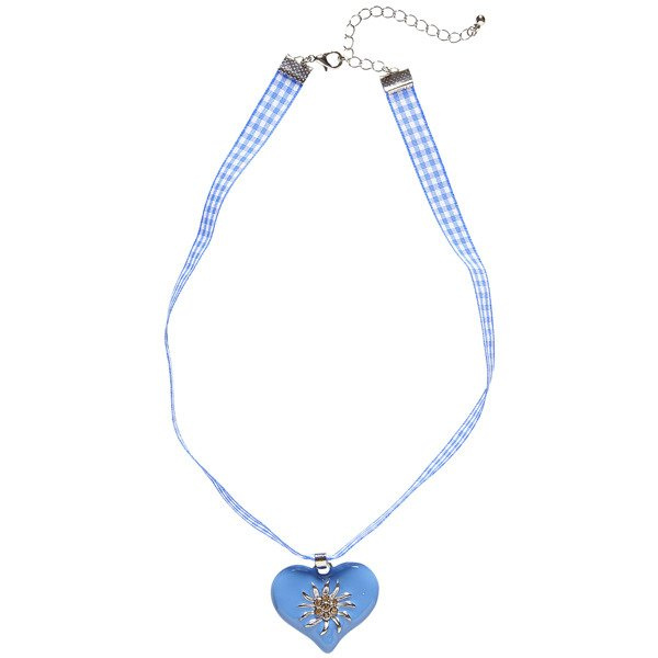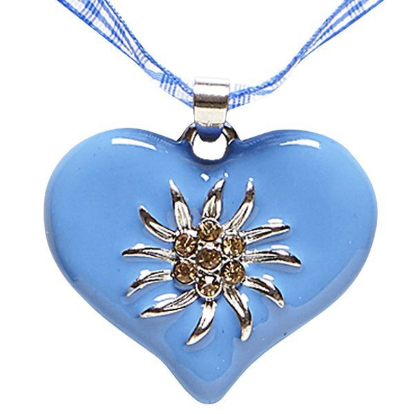 Naszyjnik bawarski z niebieskim sercem i kwiatem szarotki.