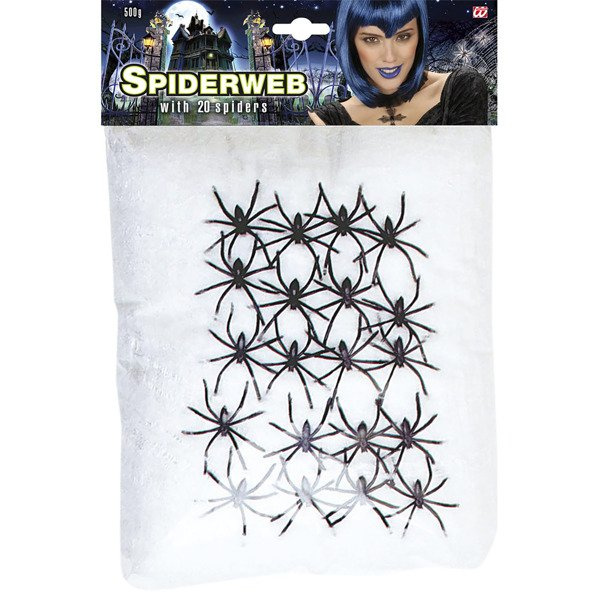 Pajęczyna w kolorze białym w zestawie 20 pająków, waga 500 g.