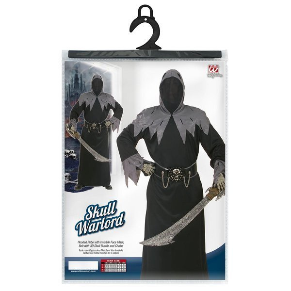 Zestaw zawiera szatę z kapturem i maską oraz pas z czaszką i łańcuszkami.