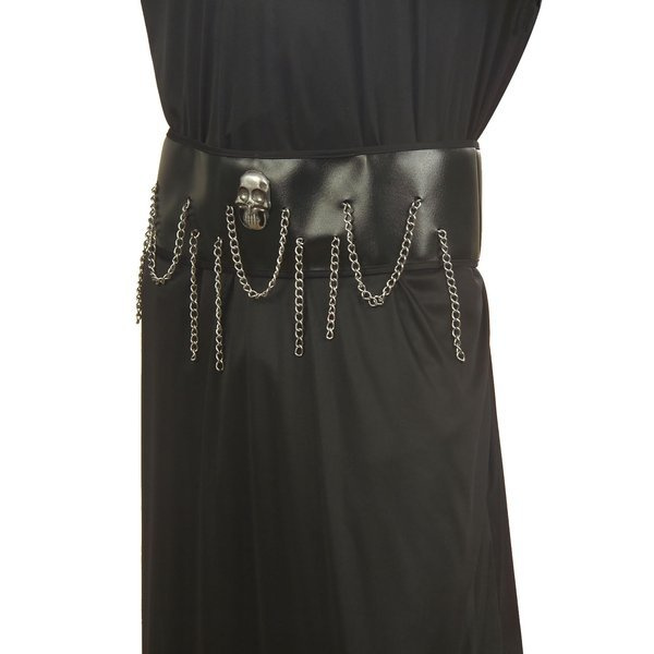 Zestaw zawiera szatę z kapturem, kołnierz oraz pas z czaszkami i łańcuszkami.