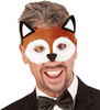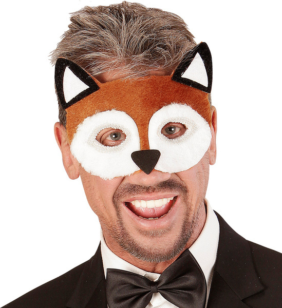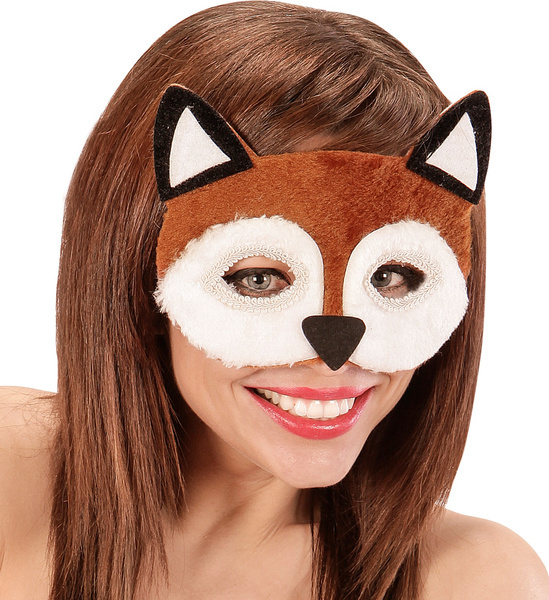 Maska koloru brązowo-białego. W masce wycięte są otwory na oczy. Mocowana na gumce. Maska wykonana z pluszu.