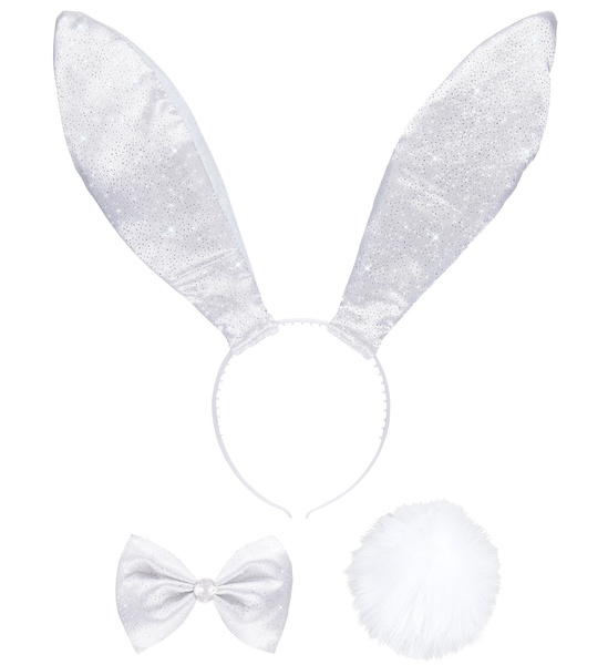Opaska wykonana z solidnego tworzywa sztucznego. Elastyczna i lekka, nie uciska głowy. Opaska obszyta białym materiałem. Do opaski przyczepione dwa duże królicze uszy. Uszka wykonane z białego materiału pokrytego brokatem. Mucha wykonana z tego samego materiału. Pluszowy ogonek zapinany na agrafkę.