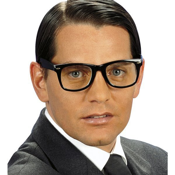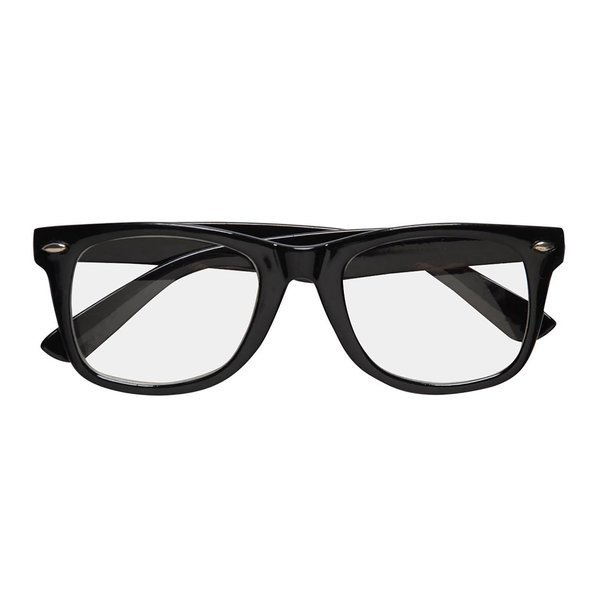Czarne okulary z tworzywa sztucznego, w kształcie tzw. kujonek.
