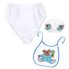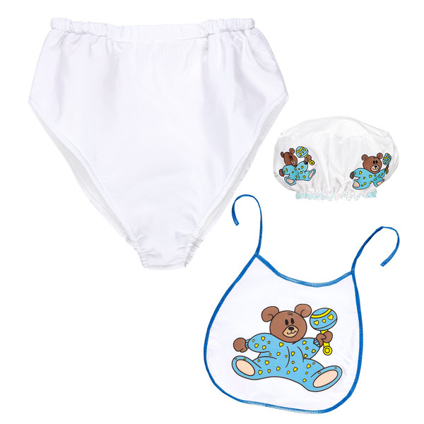 W zestawie śliniaczek, czepek, gigantyczną pieluszkę.