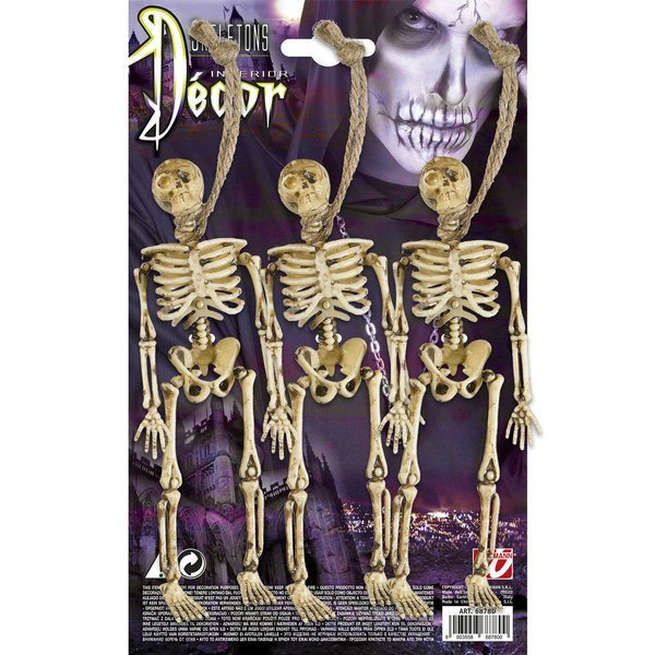 Zestaw zawiera 3 wiszące kościotrupy o wysokości 15 cm w kolorze ciemnobeżowym.