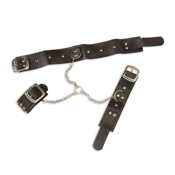 Zestaw zawiera: opaskę na szyję i opaski na nadgarstki w kolorze czarnym, połączone łańcuszkiem.