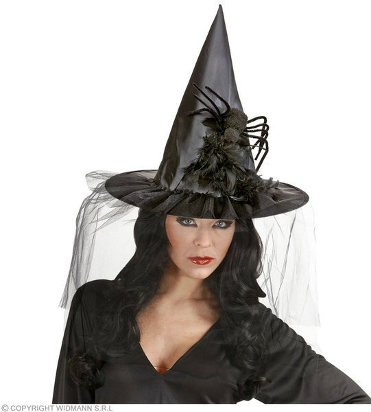 Czapka wykonana z czarnego materiału. Rondo czapki usztywnione drutem. Do czapki doszyty welon z tiulu. Dodatkowo rondo zdobione dużym pająkiem i puchem.