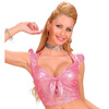 Wiązanie przy dekolcie, bluzka odsłania brzuch.