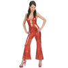 Kombinezon wykonany z metalicznego materiału w kolorze czerwonym. Posiada wycięcie w dekolcie. Nogawki w formie dzwonów. Skład: 100% poliester.