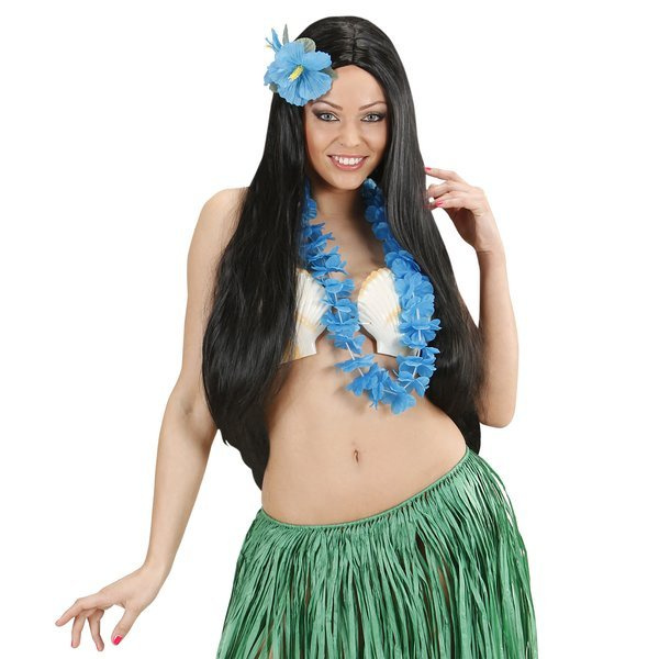 Naszyjnik Hawajski wykonany z turkusowych kwiatów z materiału, połączony białym sznurkiem.
