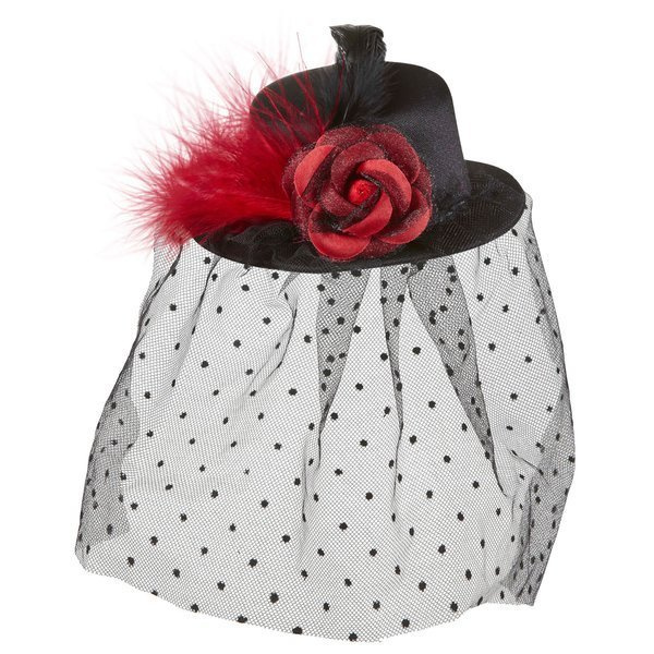 Mini kapelusik wykonany z usztywnionego czarnego materiału.