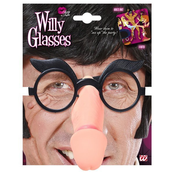 Okulary z nosem Willy i charakterystycznymi brwiami.