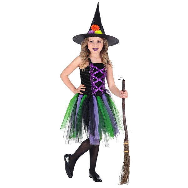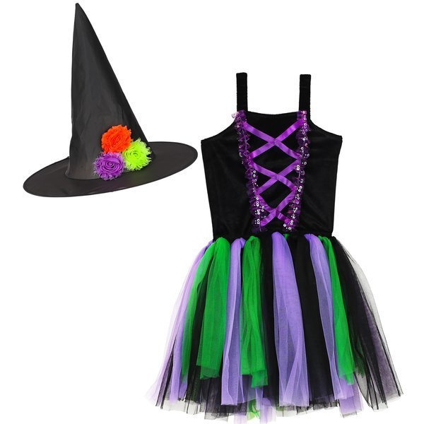 Sukienka zdobiona kolorowym tiulem sięgającym do kolan.