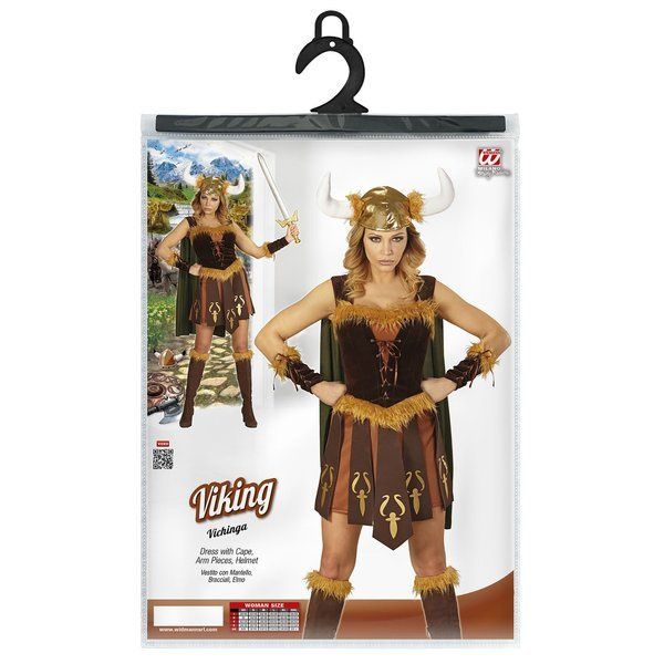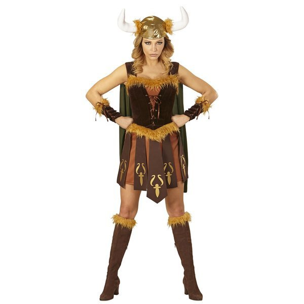 Strój Pani Wiking, Wikinga, Kostium, Karnawał, Bal, w komplecie: sukienka z peleryną, opaski na ręce i hełm.