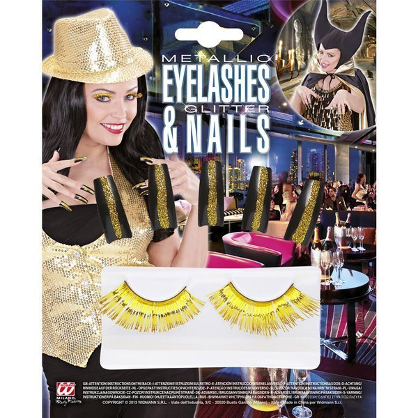 Zestaw zawiera: sztuczne rzęsy w kolorze złotym, paznokcie czarne ze złotym brokatem.