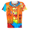 Nadruk w postaci kamizelki i kolorowego wzoru.