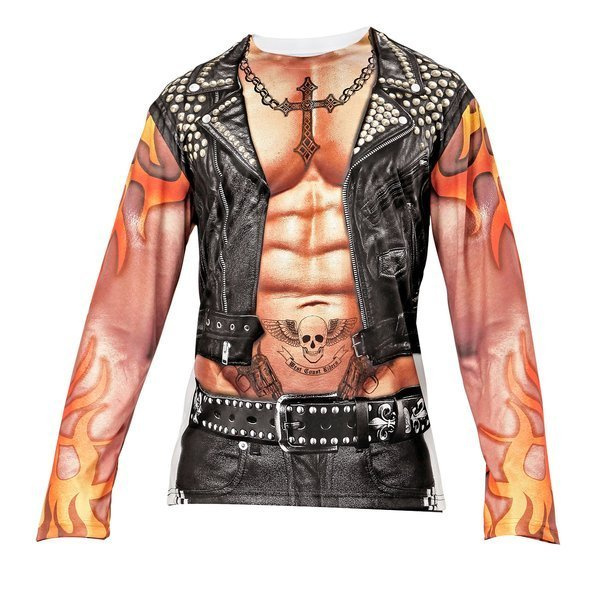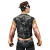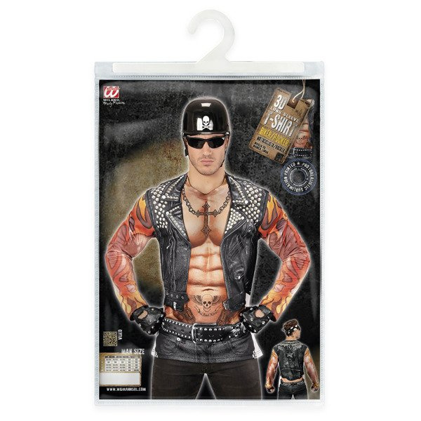 Wrażenie gołej klatki piersiowej motocyklisty ze skórzaną kataną i tatuażami.