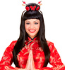 - Stylizacja: długie włosy częściowo upięte w kok, ozdobione kwiatkami i paleczkami.